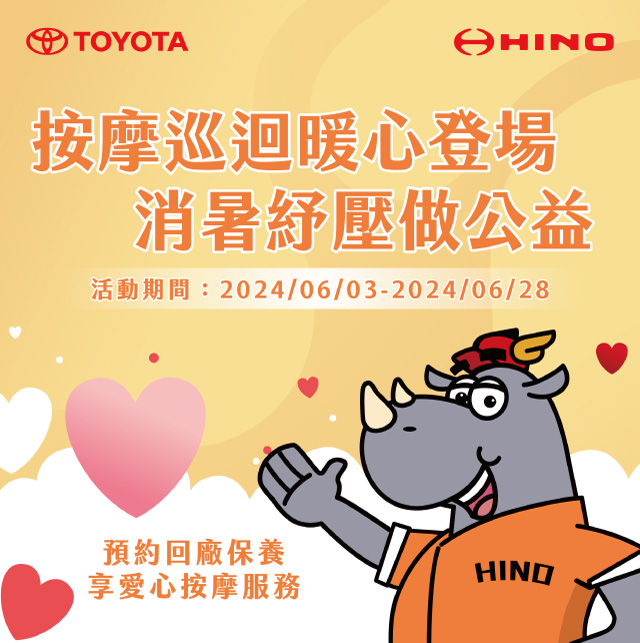 此次公益按摩巡迴活動期間自2024年6月3日起至2024年6月28日止,遍布全台19個據點,預計可以讓上千位回廠保養或來店賞車的顧客享受貼心的按摩服務。尤其許多商用車顧客是長時間駕駛的職業司機,在各自的工作崗位上辛勤付出,藉由提供專業的按摩服務協助顧客短暫放鬆筋骨、消暑紓壓。HINO透過本次公益巡迴活動支持視障工作者,也希望讓更多人能體驗到視障按摩師的優質服務。誠摯邀請顧客一起為公益盡一份心力。